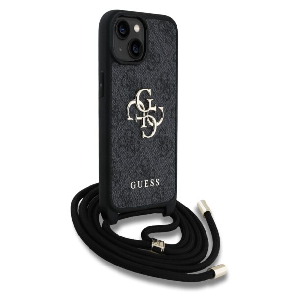 Guess PU 4G Metal Logo Crossbody Strap Apple iPhone 15 dėklas telefonui juodos spalvos