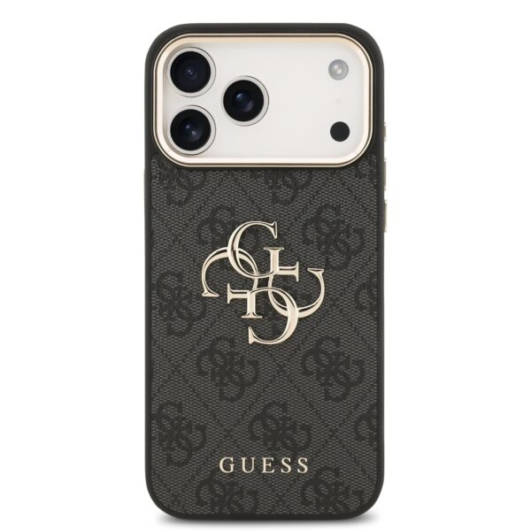Guess PU Leather 4G Metal Logo Gold Frame dėklas skirtas Apple iPhone 17 Pro Max juodos spalvos