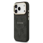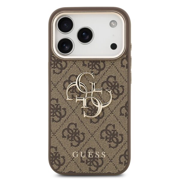 Guess PU Leather 4G Metal Logo Gold Frame dėklas skirtas Apple iPhone 17 Pro Max rudos spalvos