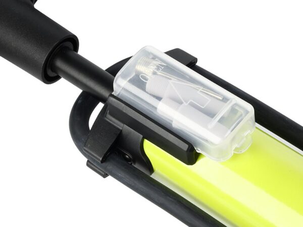 Hand pump with a maximum capacity of 11 BAR (160 PSI). Equipped with a 68 cm hose. The set includes 3 adapters, placed in a dedicated compartment.