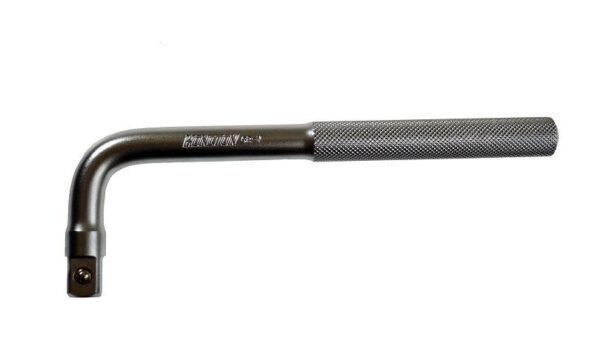 L formos rankena 1/2″ 200mm H4301 HONITON. Techniniai duomenys: pagaminta iš chromo vanadžio plieno (CrV), 1/2″ galvučių laikiklis, turi fiksavimo rutuliuką, užtikrinantį galvutės stabilumą darbo metu, rankenos ilgis 200mm.