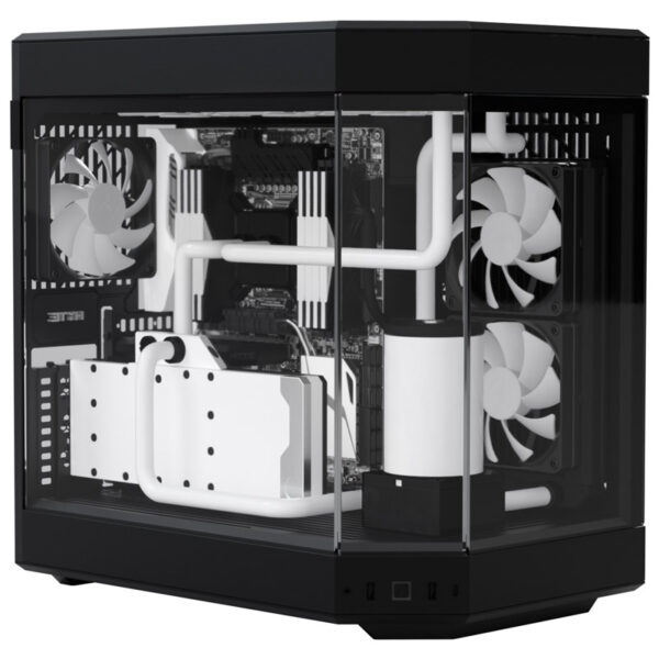 No corner pillar. The Y60 features a 3-piece panoramic tempered glass design for the ultimate photo and display potential. See your build the way it was meant to be seen from the left or right side of your desk with a simple turn.