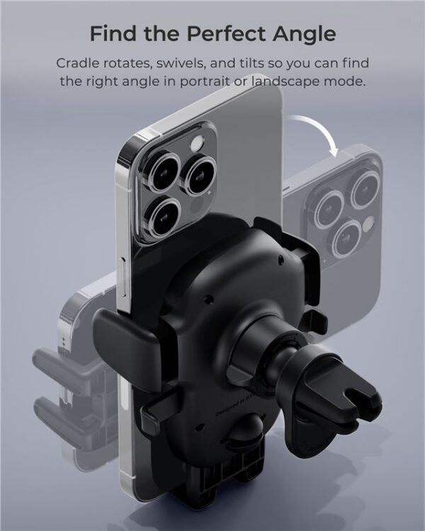 The redesigned air vent mount now offers a rotating support that prevents the mount from sliding down and allows for installation on both horizontal and vertical louvers.