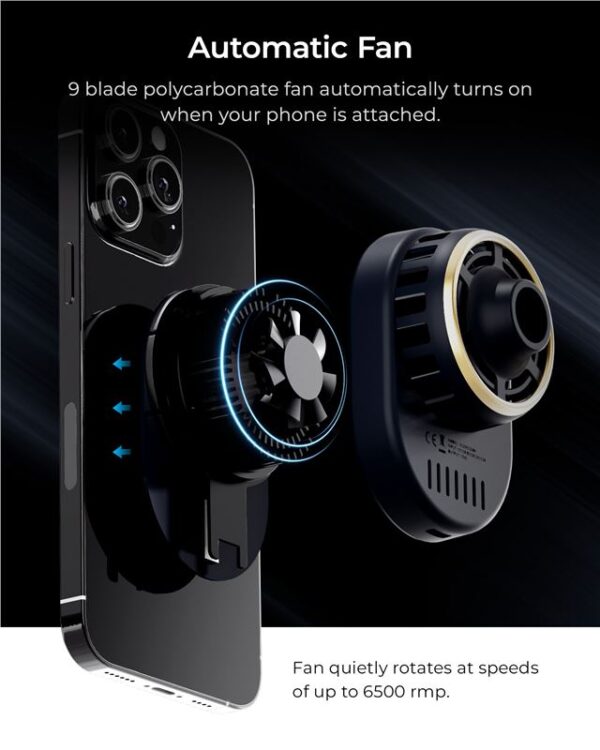 As your phone charges and begins to generate heat, the semiconductor CryoChip draws that heat away from the phone towards an aluminum heat sink, where it’s dispersed by a 9-blade polycarbonate fan.