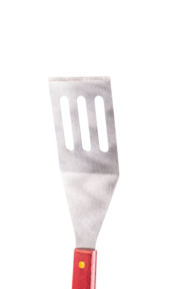 - Rinkinyje yra visi įrankiai, skirti kepti ant grotelių. Į komplektą įeina lopetėlė, šakutė ir žnyplės. Įrankio ilgis, 43 cm, užtikrina, kad kepant jūs nenusideginsite ar neapsitaškysite riebalais.