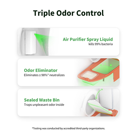 The Triple Odor Control system eliminates unpleasant odors, keeping the environment fresh. The Smart Spray air purifier developed by PETKIT removes up to 99% of bacteria inside the cylinder, while the sealed waste container and ammonia neutralizing cartridge reduce odor by more than 98%. So you can forget about offensive aromas in your home!