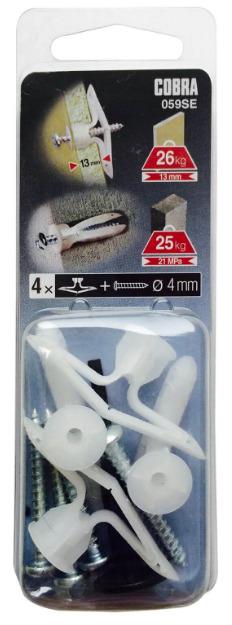 Prekės ženklas- Cobra. Įvarų tipas- Skirtas GK plokštėms . Ilgis- 31 mm. Skersmuo- 7.4 mm. Įvarų medžiaga- Nailonas. Spalva- Balta sp.. Vienetai pakuotėje- 4.