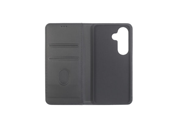 yra trys kišenėlės: dvi nedidelės skirtos kortelėms ir viena platesnė per visą dėklo aukštį. Dėklo viduje telefonas