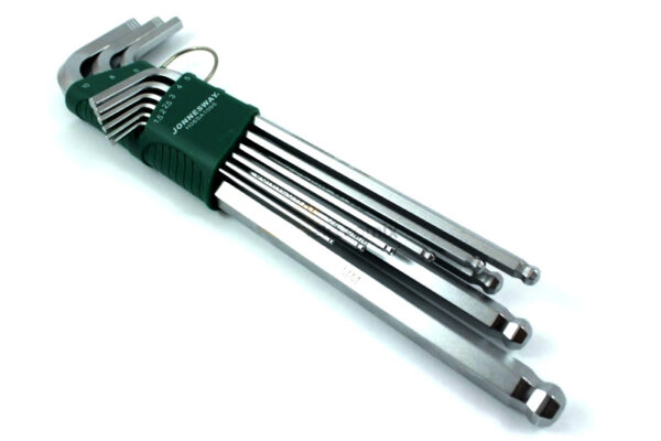 Itin ilgų neslystančių kampinių šešiakampių raktų su rutuline galvute rinkinys. Specialios griovelių įpjovos ant darbinių raktų dalių leidžia atsukti varžtus su nusidėvėjusiomis galvutėmis. Padidintas rutulinės galvutės paviršius palengvina varžtų atsukimą. Medžiaga: termiškai apdorotas S2 plienas. Rinkinyje 9 raktai, kurių dydžiai: 1,5; 2; 2,5; 3; 4; 5; 6; 8; 10 mm