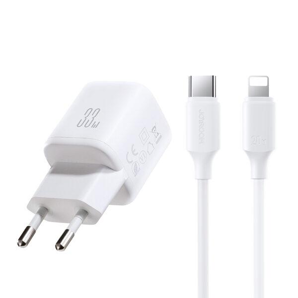Joyroom JR-TG7 33W USB-A + USB-C wall charger with 1 m USB-C – Lightning cable – white