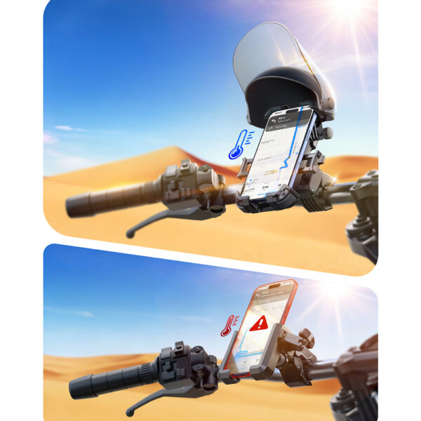 The Joyroom JR-ZS526 bike mount is a practical solution for those using their smartphone while riding. The foldable sun visor improves screen visibility in bright light, making it easier to use navigation and apps. Automatic, one-handed operation enhances user convenience, and a robust locking mechanism keeps the phone securely in place. The PC and ABS construction is durable and wear-resistant, while the shock-absorbing system reduces vibrations. This functional mount is perfect for both everyday riding and longer trips.