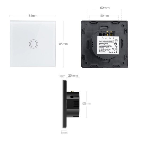Jutiklinis šviesos jungiklis MACLEAN Energy MCE702W viengubas, stiklinis, su apvaliu mygtuku Balta