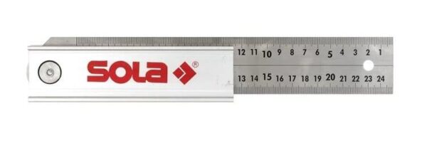Prekės ženklas- Sola. Artikulas- 56017001. Ilgis- 250 mm. Svoris- 0.229 kg. Medžiaga- Aliuminis, Nerūdijantysis plienas. Skalė- 1 mm. Gradavimas- Milimetrai, Centimetrai. Pasvirimo kampas- 45 – 135°. Reguliuojamas kampas- Taip. Su fiksatorium- Ne.