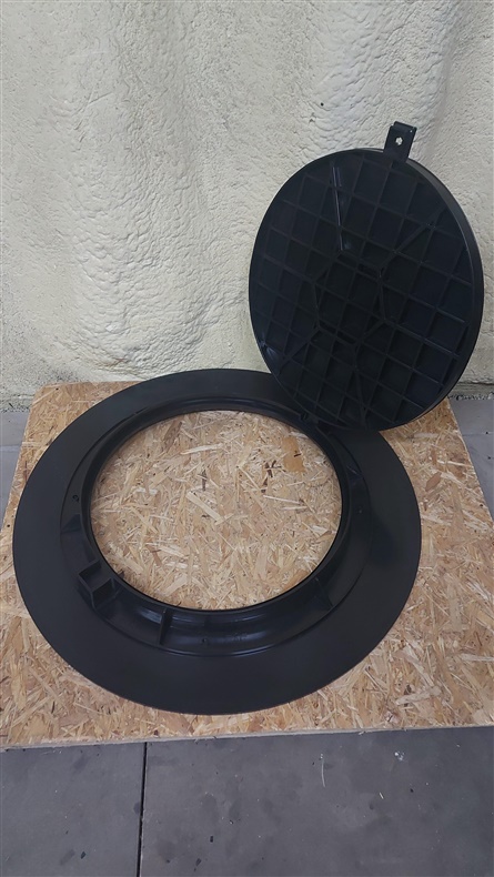 Prekės ženklas- Ginmika. Apkrovos klasė- A15. Maksimali statinė apkrova- 1.5 t. Korpuso skersmuo- 100 cm. Dangčio skersmuo- 63 cm. Aukštis- 8 cm. Svoris- 12 kg. Medžiaga- Plastikas. Spalva- Juoda. Papildoma informacija- Atverčiamo dangčio fiksacija, papildomas rakinimas varžtu, virinamas, atsparus šalčiui.
