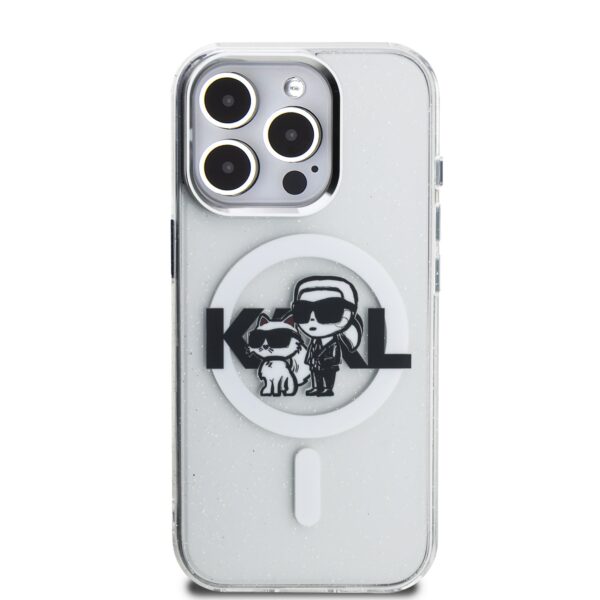 Karl Lagerfeld IML Glitter Karl and Choupette Sketch MagSafe dėklas Apple iPhone 15 Pro Max skaidrus