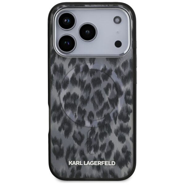Karl Lagerfeld IML Leopard Pattern MagSafe dėklas skirtas Apple iPhone 17 Pro juodos spalvos