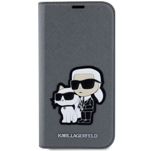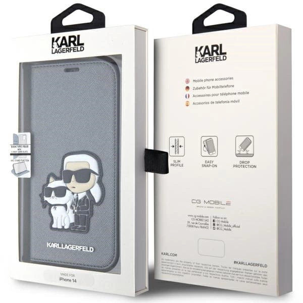 Karl Lagerfeld KLBKP14SSANKCPG Apple iPhone 14 6.1" atverčiamas dėklas telefonui sidabro spalvos Saffiano Karl & Choupette