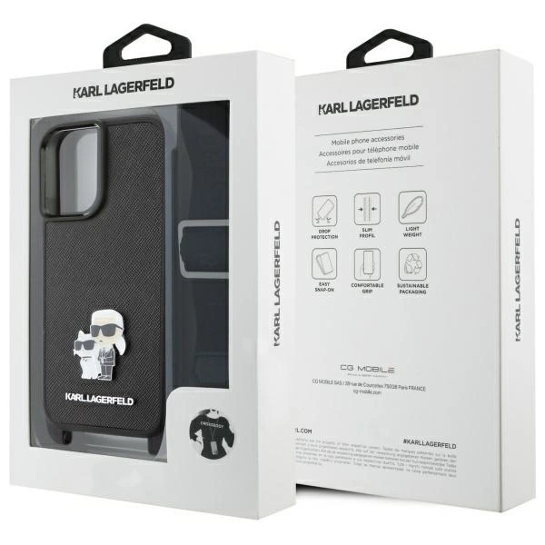 Karl Lagerfeld KLHCP16SSAKCPBK Apple iPhone 16 6.1" dėklas telefonui juodos spalvos Saffiano Karl&Choupette Metal Pin CBDY Strap