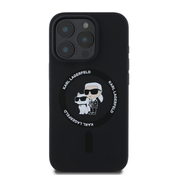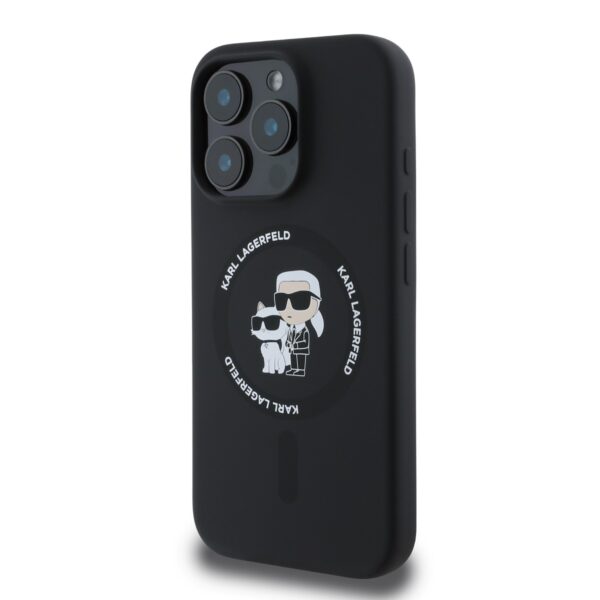 Karl Lagerfeld Liquid Silicone Karl and Choupette MagSafe dėklas skirtas Apple iPhone 16 Pro juodos spalvos