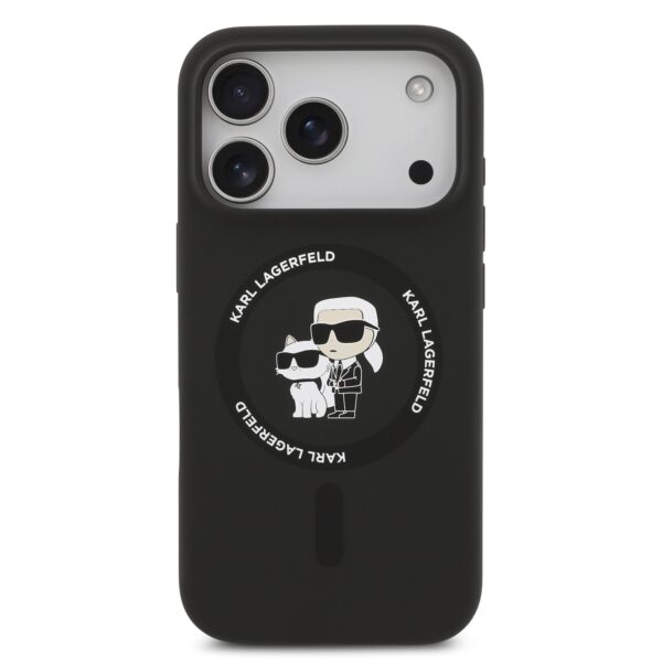 Karl Lagerfeld Liquid Silicone Karl and Choupette MagSafe dėklas skirtas Apple iPhone 17 Pro juodos spalvos
