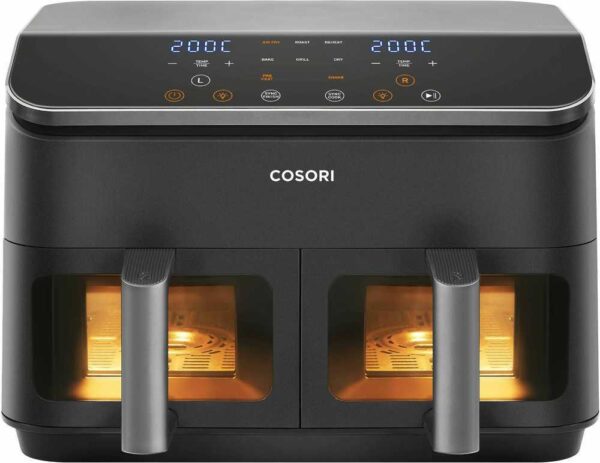 Jei ieškote būdo gaminti kelis patiekalus vienu metu, nenaudojant kelių prietaisų ar neaukojant skonio, „Cosori“ dviejų krepšelių oro gruzdintuvė yra tinkamas pasirinkimas jums. Ji turi du nepriklausomus krepšelius, leidžiančius vienu metu gaminti du skirtingus patiekalus, naudojant skirtingus temperatūros ir laiko nustatymus. „Cosori“ dviejų krepšelių oro gruzdintuvėje naudojama „360 ThermoIQ™“ technologija, kuri užtikrina, kad jūsų patiekalai būtų tolygiai iškeptų, sultingi viduje ir traškūs išorėje, naudojant mažai arba visai nenaudojant aliejaus. „Cosori“ dviejų krepšelių oro gruzdintuvę labai lengva valdyti, joje yra jutiklinis valdymo skydelis su intuityvia sąsaja. Dėl skaidrių langų, pagamintų iš aukštos kokybės borosilikatinio stiklo, esančių kepimo krepšelių priekinėje sienelėje, ir įmontuoto apšvietimo galite stebėti maisto gaminimą neatidarę gruzdintuvės.