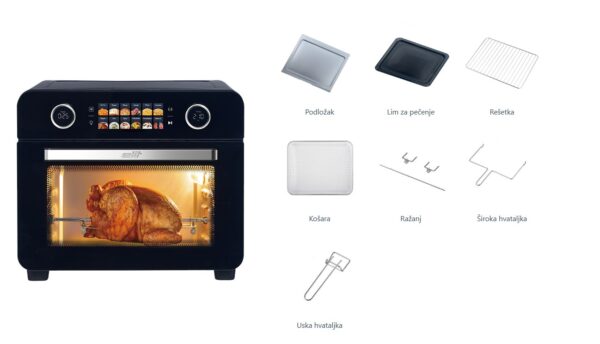 Ši 2250 W galios ir 25 l talpos konvekcinė orkaitė siūlo universalias gaminimo galimybes su 12 iš anksto nustatytų programų ir „pasidaryk pats“ režimu. Ji aprūpinta dideliu ekranu, tiksliu temperatūros valdymu nuo 35 iki 230 °C ir skaitmeniniu laikmačiu iki 9 valandų. Dvigubos grūdinto stiklo durelės ir cinkuotas vidus užtikrina patvarumą ir saugumą.