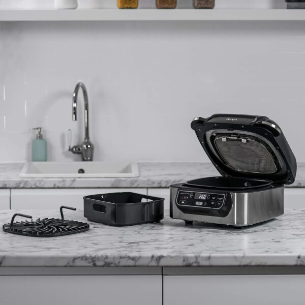 Su „Ninja Foodi Health Grill & Air Fryer“ greitai ir lengvai pasigaminsite mėgstamus patiekalus, tolygiai gamindami ir apkepdami šviežius ir šaldytus ingredientus naudodami mažai arba visai nepridedant aliejaus – nuo garbančių kepsnių ir ant grotelių keptos žuvies iki ant grotelių keptų halloumi iešmelių ir traškių traškučių.