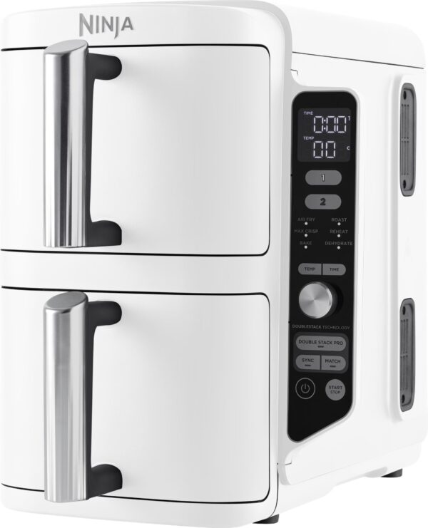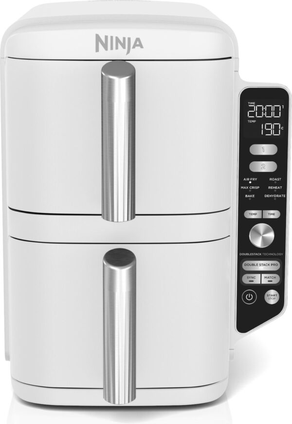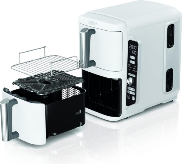 Lengvai pasiekiamas elegantiškas valdymo skydelis yra šone, todėl kiekviename stalčiuje lengva pasirinkti norimus nustatymus. Žinome, kad gyvenimas yra užimtas ir galime būti išsiblaškę, todėl „Ninja“ karšto oro gruzdintuvės automatiškai nutraukia maisto gaminimą, kai baigiasi kepimo programa. Dėžutėje yra šefo sukurtas receptų vadovas, kuriame rasite idėjų, padėsiančių gaminti, ir gaminimo diagramų, padėsiančių maksimaliai išnaudoti naująjį prietaisą.