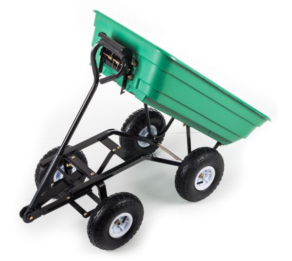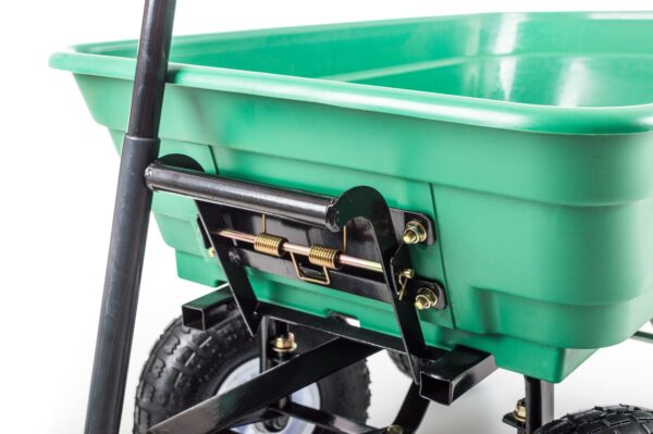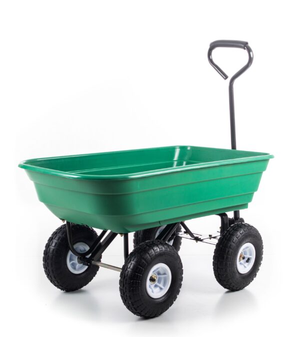- Vežimėlis turi praktišką, neperšlampamą 90 l talpos kėbulą , 130 kg keliamąją galią ir 4 pripučiamus ratus ant dviejų ašių, iš kurių vienas yra vairas. Dėl to vežimėlį lengva valdyti ir labai lengva bei patogu valdyti.