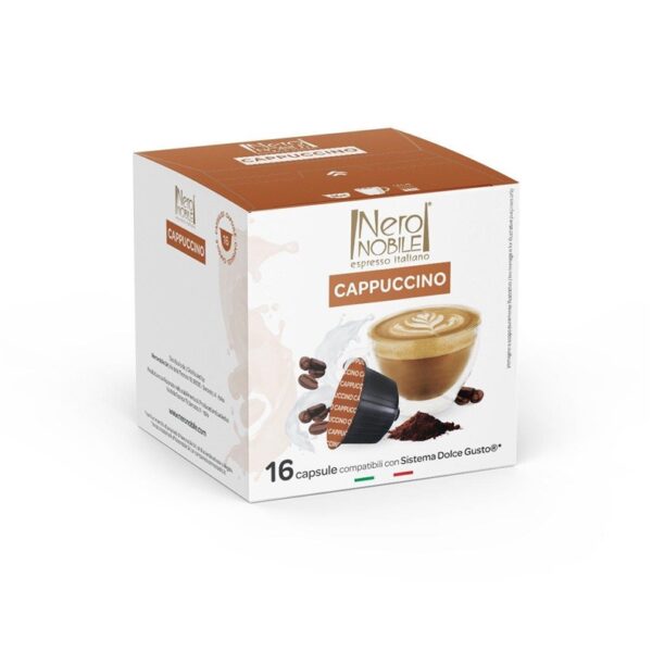 Prekės ženklas- Neronobile. Kavos tipas- Kavos kapsulės. Svoris- 0.144 kg. Sudėtis- Nenugriebto pieno milteliai, cukrus 18 %, emulsiklis sojų lecitinas, arabika. Kapsulių pakuotėje- 16. Gėrimų iš vienos pakuotės- 16. Puodelio dydis / gėrimo tūris- 150 ml. Papildoma informacija- 16 puodelių. Alergenai- Pienas. Kavos kapsulių tipas- Nescafé Dolce Gusto.