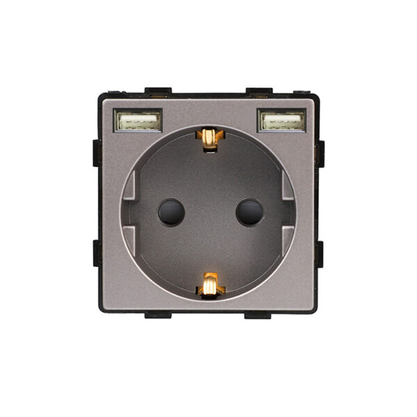 Pilkos spalvos kištukinis lizdas Feelspot FSKL2USB1G su 2 vnt. USB jungtimis. Kištukinis lizdas (rozetė) pasižymi išskirtiniu moderniu dizainu, o pasirinktas rėmelis derės bet kuriame interjero dizaine. Kištukinis lizdas turi 2 vnt. USB lizdus, kurie leis greitai ir lengvai įkrauti mobilųjį telefoną ar kitą, USB jungtimi kraunamą, įrenginį. Pilkos spalvos kištukinis lizdas Feelspot turi įžeminimą, apsaugą nuo vaikų bei yra pritaikytas naudoti pagal Europinį standartą.