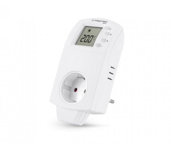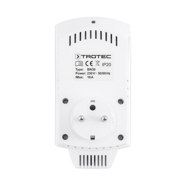 Kištukinis neprogramuojamas termostatas (termoreguliatorius) Trotec BN30 valdo šildymo ir kondicionavimo prietaisų temperatūrą nuo 5 °C iki 30 °C. Tiesiog įkiškite termostatą į elektros lizdą, o šildymo ar kondicionavimo įrenginį prijunkite laidu prie termostato. Kištukinis neprogramuojamas termostatas (termoreguliatorius) Trotec BN30 matuoja esamą kambario temperatūrą (naudojant integruotus jutiklius) ir pagal tai reguliuoja prie jo prijungtus šildymo/kondicionavimo prietaisus. Kištukinis neprogramuojamas termostatas (termoreguliatorius) Trotec BN30 turi jutiklius, kurie matuoja kambario temperatūrą 10 sekundžių intervalais ir reguliuoja prijungtą šildymo arba oro kondicionavimo įrenginį pagal užprogramuotą temperatūrą. Platus termostato ekranas rodo esamą kambario temperatūrą bei dingus elektrai išsaugo nustatytus parametrus. Kištukinis neprogramuojamas termostatas (termoreguliatorius) Trotec BN30 leis mėgautis universaliu naudojimu ir nuolatine švara – dėl kištukinio įrenginio tipo, jo nereikės įleidinėti ar kitaip įmontuoti į sieną. Taip pat, šis Trotec BN30 termostatas džiugins paprastu naudojimu ir efektyviu veikimu!