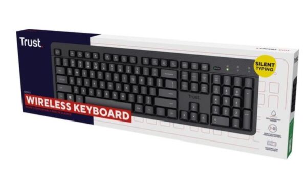 Prekės ženklas- Trust. Modelis- II. Klaviatūros tipas- Belaidė. Ilgis- 13.6 cm. Plotis- 42.2 cm. Aukštis- 3.7 cm. Spalva- Juoda. Jungties tipas- Bevielis USB. Klaviatūros kalba- Anglų (US). Klavišų tipas- Mechaniniai. Foninis apšvietimas- Ne. Multimedijos klavišai- Taip. Atskiras skaičių blokas- Taip. Naudojamos baterijos- 2x AAA. Pelė komplekte- Ne. Jautrumas (DPI)- 800 – 1600. Garantija- 24 mėn.