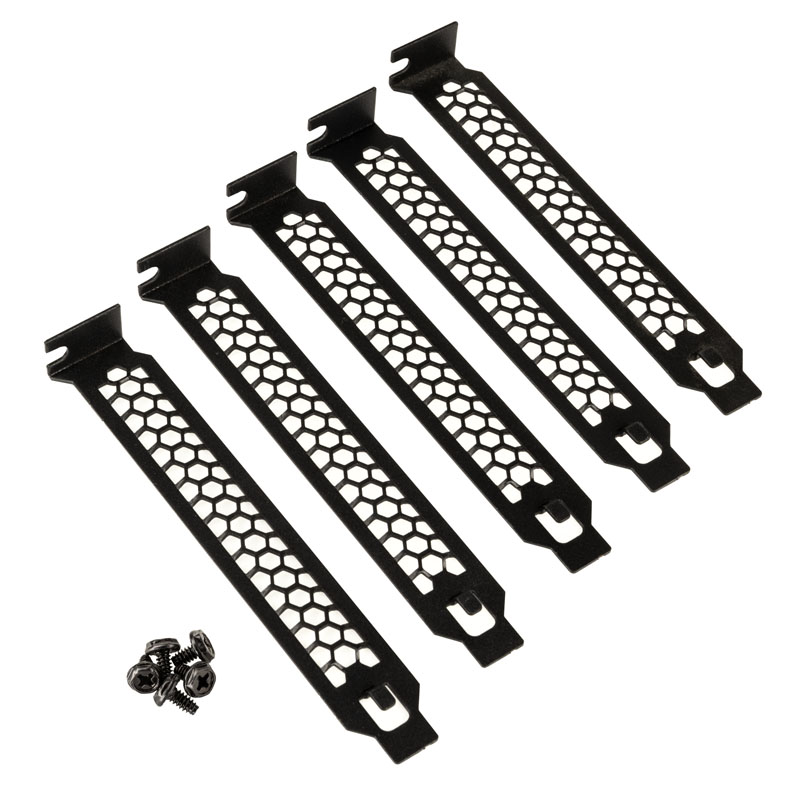 Black covers for PCI-E expansion slots, to enhance the passive cooling of a case, including screws