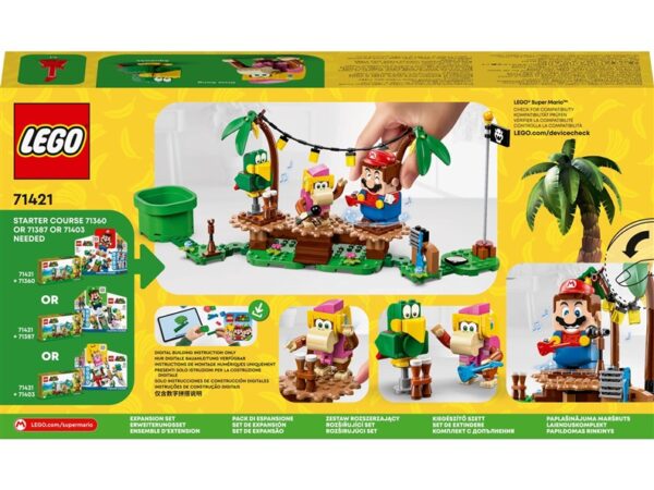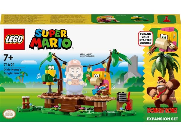Prekės tipas- Konstruktoriai. Prekės ženklas- LEGO®. Artikulas- 71421. Kolekcija- Super Mario. Medžiaga- Plastikas. Modelis- Dixie Kong’s Jungle Jam Expansion Set. Komplekto dalių skaičius- 174. Įspėjimas dėl žaislų- Netinka vaikams iki 3 metų., Pašalinkite visą pakuotę, tvirtinimo detales prieš perduodant šį žaislą vaikui. Ant pakuotės esančią informaciją rekomenduojama išsaugoti. Rekomenduojama naudoti prižiūrint suaugusiems. Gali būti smulkių arba aštrių detalių, kuriomis vaikas gali užspringti arba susižeisti.. Rekomenduojamas amžius nuo- 7 m..