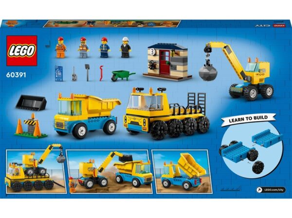 Prekės tipas- Konstruktoriai. Prekės ženklas- LEGO®. Artikulas- 60391. Kolekcija- City. Medžiaga- Plastikas. Modelis- Construction Trucks and Wrecking Ball Crane. Įspėjimas dėl žaislų- Netinka vaikams iki 3 metų., Pašalinkite visą pakuotę, tvirtinimo detales prieš perduodant šį žaislą vaikui. Ant pakuotės esančią informaciją rekomenduojama išsaugoti. Rekomenduojama naudoti prižiūrint suaugusiems. Gali būti smulkių arba aštrių detalių, kuriomis vaikas gali užspringti arba susižeisti.. Rekomenduojamas amžius nuo- 4 m..