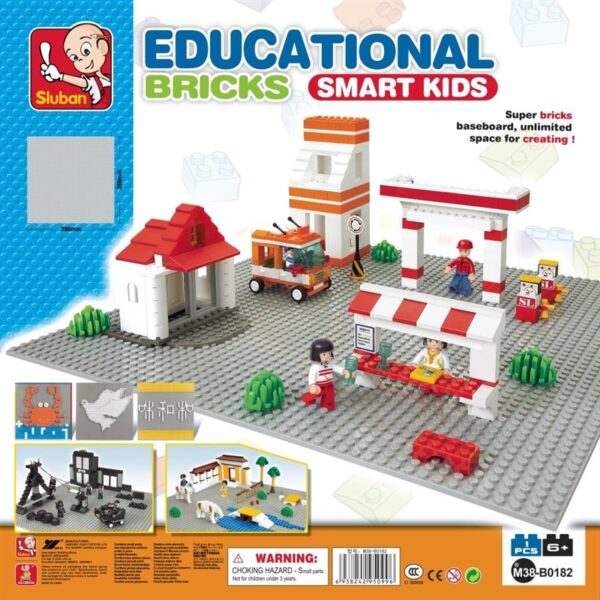 Prekės ženklas- Sluban. Artikulas- M38-B0182. Kolekcija- Educational bricks. Medžiaga- Plastikas. Modelis- Smart kids. Komplekto dalių skaičius- 1. Įspėjimas dėl žaislų- Netinka vaikams iki 3 metų., Pašalinkite visą pakuotę, tvirtinimo detales prieš perduodant šį žaislą vaikui. Ant pakuotės esančią informaciją rekomenduojama išsaugoti. Rekomenduojama naudoti prižiūrint suaugusiems. Gali būti smulkių arba aštrių detalių, kuriomis vaikas gali užspringti arba susižeisti.. Rekomenduojamas amžius nuo- 4 m.. Papildoma informacija- Pagrindas konstravimui. Matmenys: 40 x 40 cm. Įvairių spalvų..
