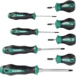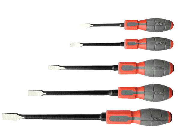 Pagaminti iš įrankinio plieno, juodinti paviršiai, plastikinė rankena, ašmenys per visą rankenos ilgį. Skirti kalimui, su šešiakampe galvute darbui su veržliarakčiu. Komplekte esantys atsuktuvai: 0,8×5,5mm 1,0×6,5mm 1,2×8,0mm 1,6x10mm 2,0x13mm