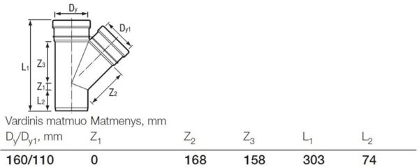 Prekės ženklas- Wavin. Santechninė jungtis, skersmuo- 160 mm – Lygus galas, 160 mm – Movinis galas, 110 mm – Movinis galas. Pasvirimo kampas- 45 – 45°. Lanksti- Ne. Medžiaga- Polivinilchloridas (PVC). Spalva- Ruda. Skirta naudoti- Lauko kanalizacijai.
