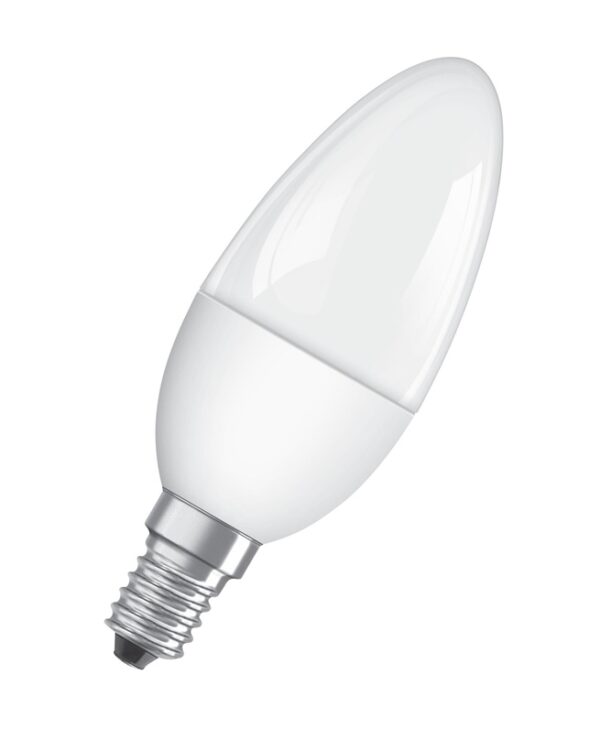 Prekės tipas- Lemputės. Artikulas- 4058075430914. Prekės ženklas- Osram. Lemputės tipas- LED. Ilgis- 35 – 35mm. Plotis- 35 – 35mm. Aukštis- 106 – 106mm. Įtampa- 220 – 240V. Cokolis- E14. Šviesos srautas- 470 – 470lm. Lemputės forma- Žvakutė. Šviesos spalva- Šiltai balta. Spalvos temperatūra- 2700 – 2700°K. Paviršiaus/stiklo tipas- Matinis. Šviesos srauto reguliavimas- Taip. Lemputės formos žymėjimas- B35. Spalvos perteikimo indeksas (CRI)- 80. Lemputės efektyvumas- 94 lm/W. Energinio efektyvumo klasė- F. Vidutinė veikimo trukmė- 25000 h. Su reflektoriumi- Ne. Belaidis valdymas (Wi-Fi)- Ne. Su valdymo pulteliu- Ne. Galima nuotolinio valdymo funkcija- Ne. Vienetai pakuotėje- 1. Papildoma informacija- Lygiavertė 40W standartinei lempai. Garantija- 48 mėn.