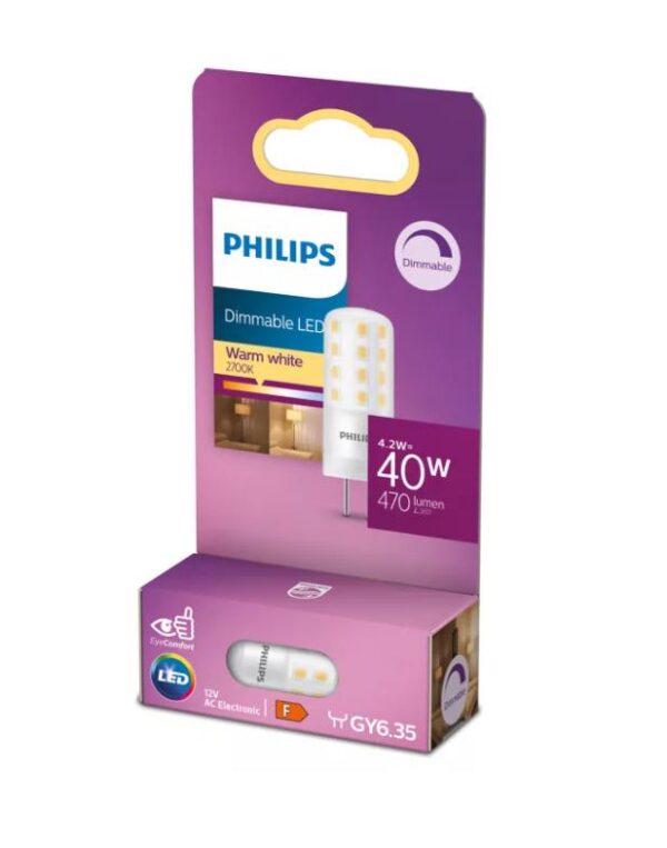 Prekės tipas- Lemputės. Artikulas- 929003609058. Prekės ženklas- Philips. Lemputės tipas- LED. Ilgis- 50 – 50mm. Plotis- 18 – 18mm. Aukštis- 50 – 50mm. Įtampa- 12 – 12V. Cokolis- GY6.35. Šviesos srautas- 470 – 470lm. Lemputės forma- Kapsulė. Šviesos spalva- Šiltai balta. Spalvos temperatūra- 2700 – 2700°K. Paviršiaus/stiklo tipas- Matinis. Šviesos srauto reguliavimas- Taip. Lemputės formos žymėjimas- T12. Energinio efektyvumo klasė- F. Vidutinė veikimo trukmė- 15000 h. Vienetai pakuotėje- 1. Privaloma garantija- 24 mėn.