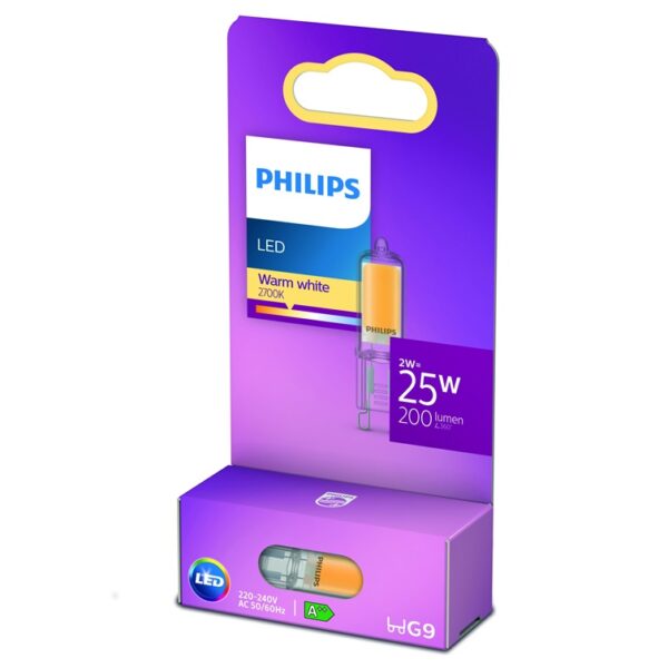 Prekės tipas- Lemputės. Artikulas- 929002326201. Prekės ženklas- Philips. Lemputės tipas- LED. Ilgis- 13.5 – 13.5mm. Plotis- 13.5 – 13.5mm. Aukštis- 50 – 50mm. Įtampa- 220 – 240V. Cokolis- G9. Šviesos srautas- 204 – 204lm. Lemputės forma- Kapsulė. Šviesos spalva- Šiltai balta. Spalvos temperatūra- 2700 – 2700°K. Paviršiaus/stiklo tipas- Skaidrus. Šviesos srauto reguliavimas- Ne. Lemputės formos žymėjimas- T5. Lemputės efektyvumas- 100 lm/W. Šviesos intensyvumas- 80 cd. Energinio efektyvumo klasė- E. Energijos sąnaudos, kWh/1000 h- 2. Vidutinė veikimo trukmė- 15000 h. Su reflektoriumi- Ne. Belaidis valdymas (Wi-Fi)- Ne. Su valdymo pulteliu- Ne. Galima nuotolinio valdymo funkcija- Ne. Papildoma informacija- Lygiavertė standartinei 25 W lemputei. Privaloma garantija- 24 mėn.
