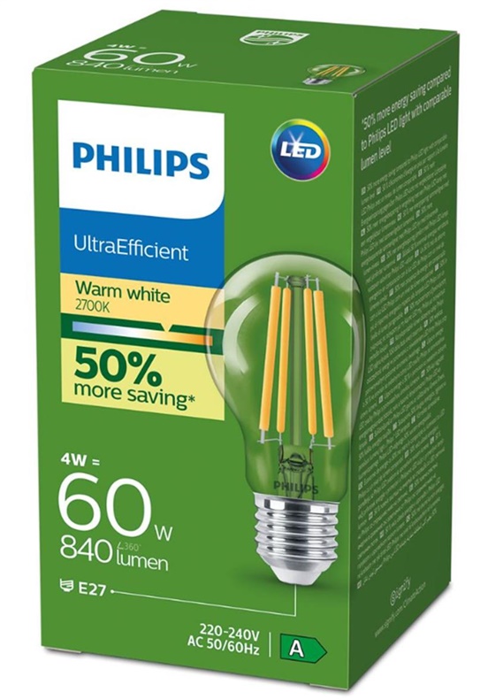 Prekės tipas- LED lemputės. Artikulas- 929003623595. Prekės ženklas- Philips. Lemputės tipas- LED. Ilgis- 115 – 115mm. Plotis- 60 – 60mm. Aukštis- 60 – 60mm. Įtampa- 220 – 240V. Cokolis- E27. Šviesos srautas- 840 – 840lm. Lemputės forma- Apvali/burbuliukas. Šviesos spalva- Šiltai balta. Spalvos temperatūra- 2700 – 2700°K. Paviršiaus/stiklo tipas- Skaidrus. Šviesos srauto reguliavimas- Ne. Lemputės formos žymėjimas- A60. Energinio efektyvumo klasė- A. Vidutinė veikimo trukmė- 15000 h. Privaloma garantija- 24 mėn. Garantija juridiniams asmenims- 12 mėn.