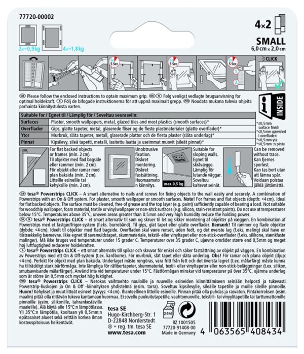 Prekės ženklas- Tesa. Modelis- Power-Strips 77720. Artikulas- 77720. Skirta apdailos darbams- Vidaus. Ilgis- 0.06 m. Plotis- 2 cm. Spalva- Balta. Lipnios juostos tipas- Dvipusė. Atsparus drėgmei- Taip. Aukščiausia naudojimo temperatūra – 40 °C. Tinka jautriems paviršiams- Taip. Papildoma informacija- Max. laikomas svoris 1.8kg.