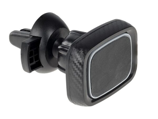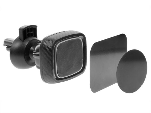Convenient and ergonomic magnetic holder mounted on the air went grille with a spring clip. It is euipped with a strong magnet that will easily hold most mobile devices. Set includes two metal plates to stick on devices with a non-metal housing.