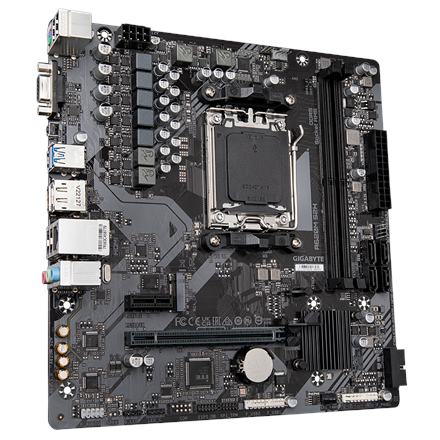 | Summary | GIGABYTE A620M S2H Motherboard – Supports AMD Ryzen 8000 CPUs, 5+2+2 Phases Digital VRM, up to 7200MHz DDR5 (OC), 1xPCIe 4.0 M.2, GbE LAN, USB 3.2 Gen 1. Processor manufacturer: AMD, Processor socket: Socket AM5, Compatible processor series: AMD Ryzen 7000 Series. Supported memory types: DDR5-SDRAM, Maximum internal memory: 96 GB, Memory slots type: DIMM. Supported storage drive interfaces: M.2, SATA III, Supported storage drive types: HDD & SSD, RAID levels: 0, 1, 10. Maximum resolution: 4096 x 2160 pixels. USB connector type: USB Type-A, USB Type-C |