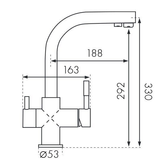 - Filtruoto vandens jungtis (kairėje)