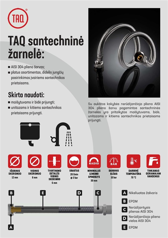 Prekės ženklas- Tucai S.A.. Medžiaga- Guma, Nerūdijantysis plienas. Ilgis- 100 cm. Santechninė jungtis, skersmuo- M10 (37 mm), V1/2″. Vidinis skersmuo- 8 mm. Išorinis skersmuo- 12 mm. Darbinė temperatūra- 1 – 90°C. Darbinis slėgis- 10 Bar. Minimalus lanko spindulys- 30 mm. Su alkūnėle- Ne. Privaloma garantija- 24 mėn. Papildoma informacija- Ilgis: 1 m. Jungtis: 1/2″.