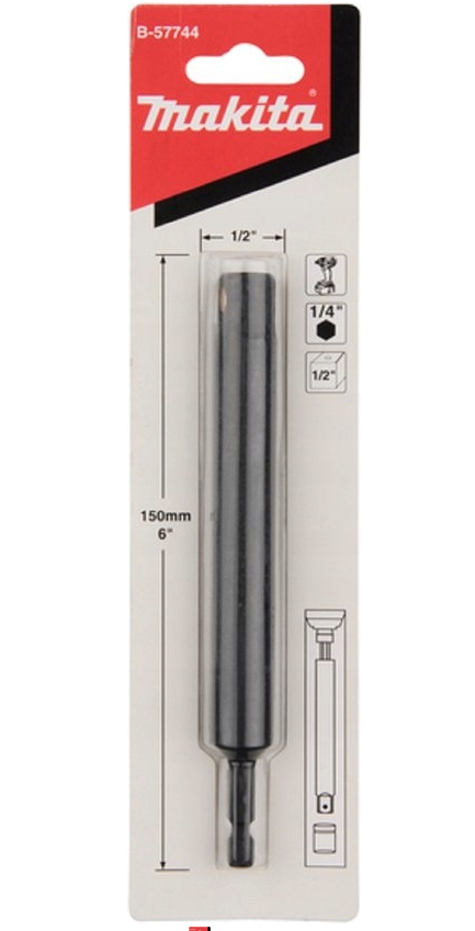 Adapteris ilgintuvas 1/4″ į 1/2″ 150mm B-57744 Makita Techninė specifikacija Ilgis 150mm Grąžto griebtuvas HEX 1/4″ į kvadratą 1/2″