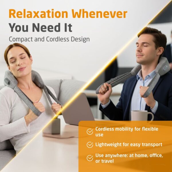 Kaklo masažuoklį galima naudoti ne tik kaklui ir pečiams, bet ir nugarai, pilvui, šlaunims bei blauzdoms. Tai leidžia lanksčiai pritaikyti prietaisą pagal individualius poreikius ir skirtingas kūno vietas – puikiai tinka asmeninei masažo patirčiai namuose ar keliaujant.